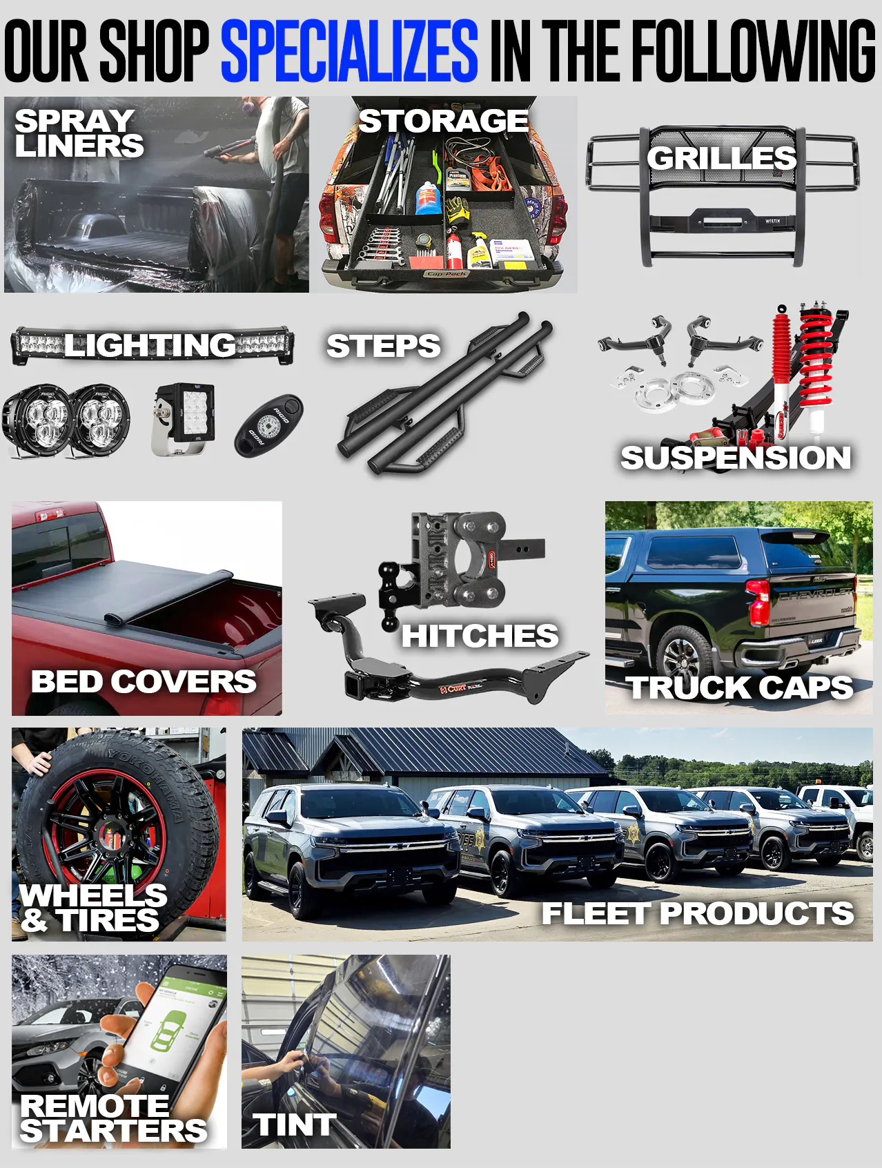 Our local shop specializes in Tonneau Covers, Truck Caps, Running Boards, Trailer Hitches, Suspension, Wheels, Tires, etc.