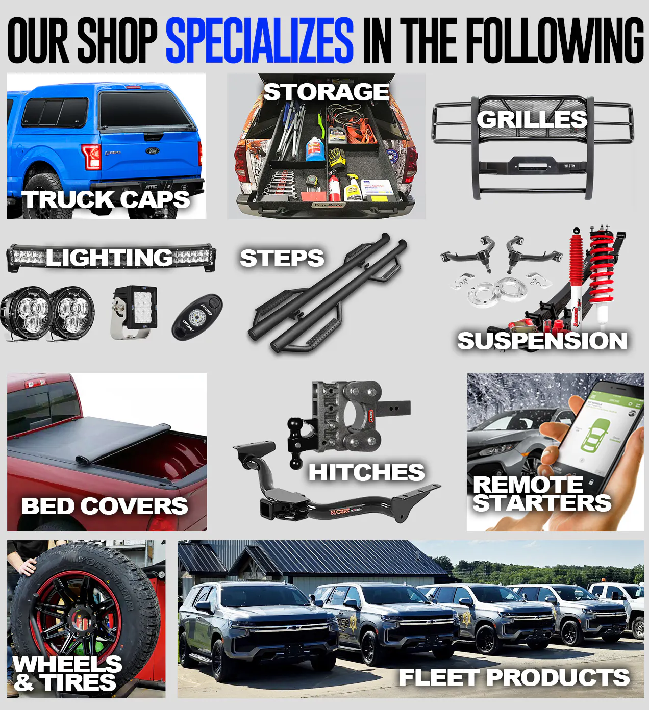 Our local shop specializes in Tonneau Covers, Truck Caps, Running Boards, Trailer Hitches, Suspension, Wheels, Tires, etc.