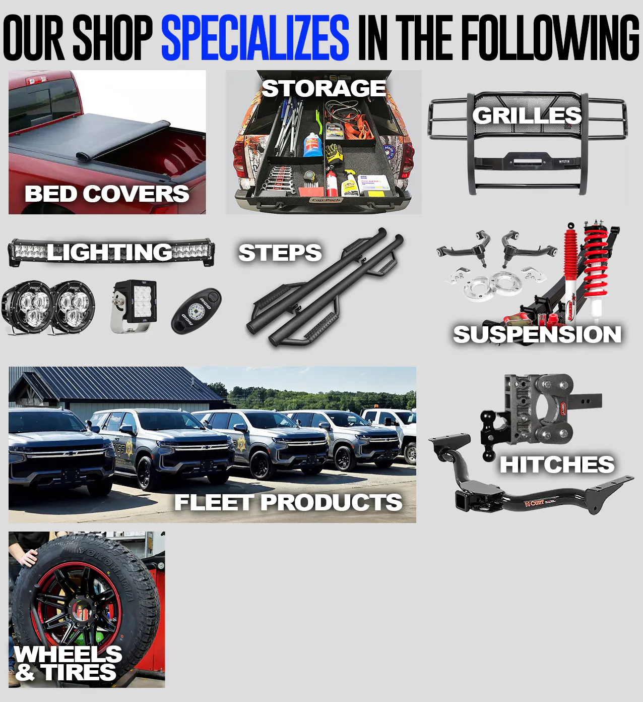 Our local shop specializes in Tonneau Covers, Truck Caps, Running Boards, Trailer Hitches, Suspension, Wheels, Tires, etc.