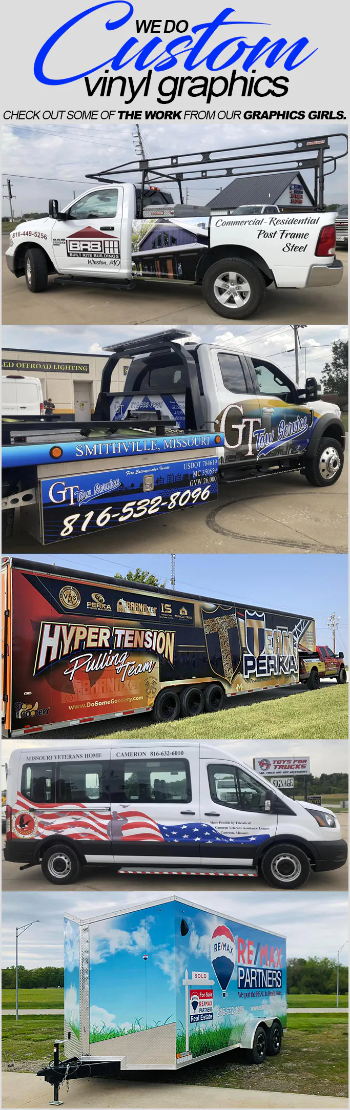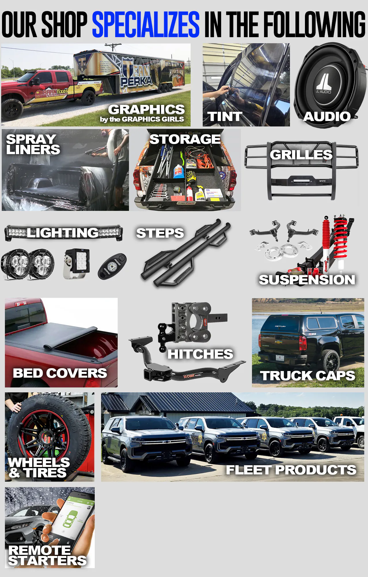 Our local shop specializes in Vinyl Vehicle Graphics, Car Audio, Fleet Products, Tonneau Covers, Truck Caps, Running Boards, Trailer Hitches, Suspension, Wheels, Tires, etc.