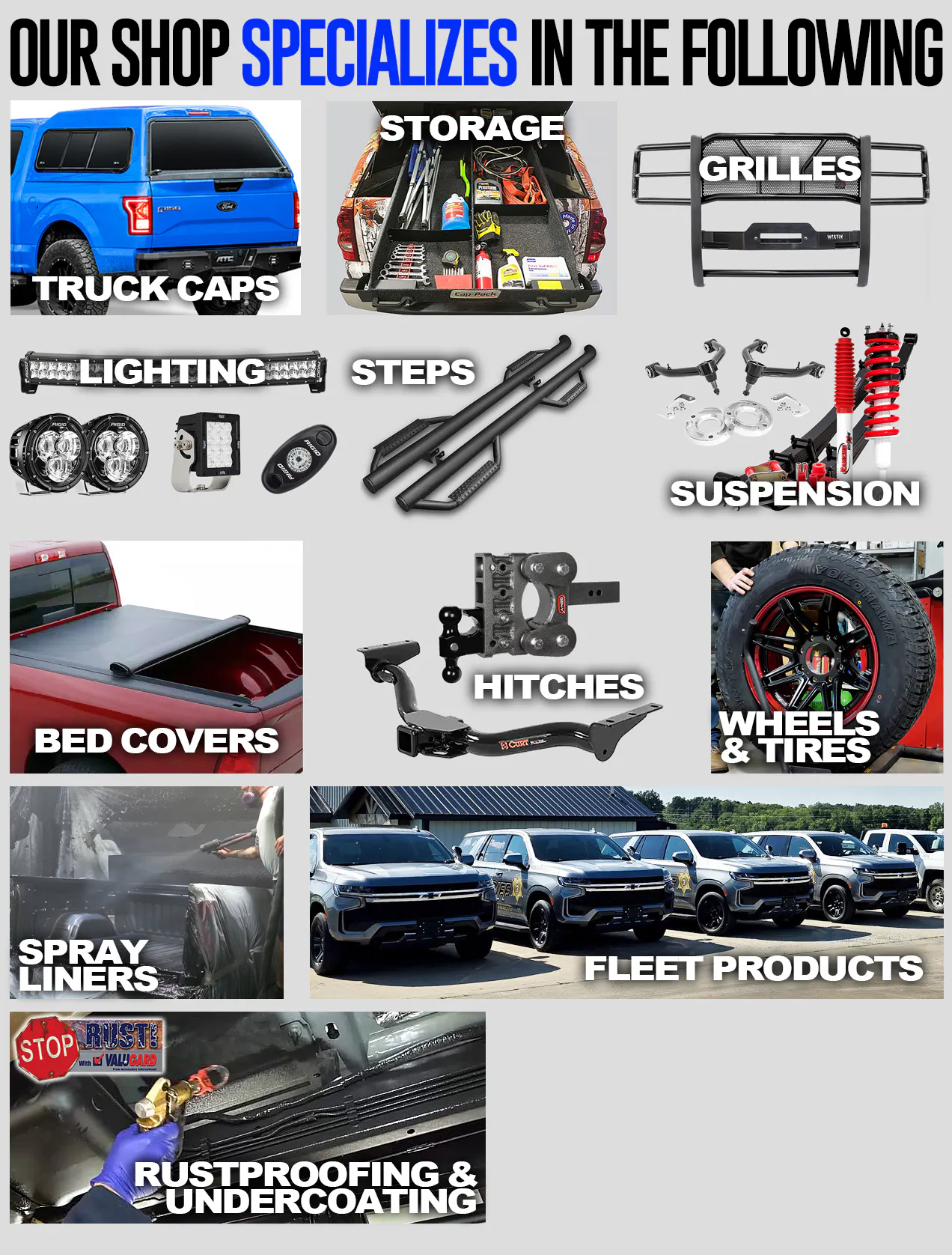 Our local shop specializes in Tonneau Covers, Truck Caps, Running Boards, Trailer Hitches, Suspension, Wheels, Tires, etc.