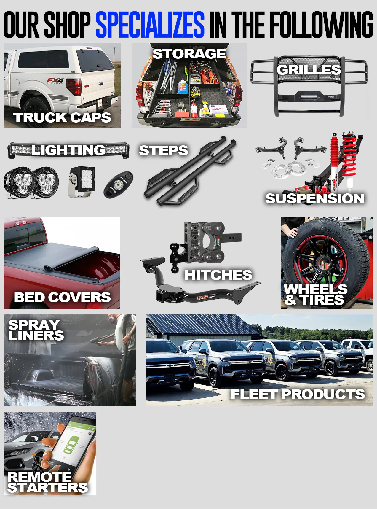 Our local shop specializes in Tonneau Covers, Truck Caps, Running Boards, Trailer Hitches, Suspension, Wheels, Tires, etc.