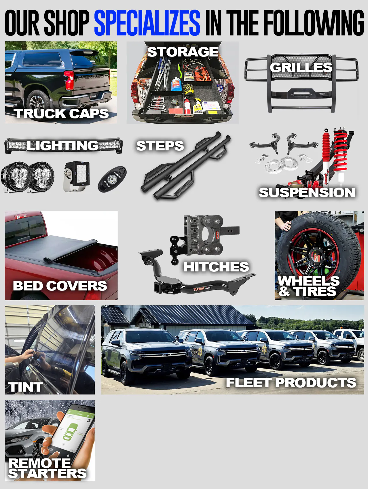 Our local shop specializes in Tonneau Covers, Truck Caps, Running Boards, Trailer Hitches, Suspension, Wheels, Tires, etc.