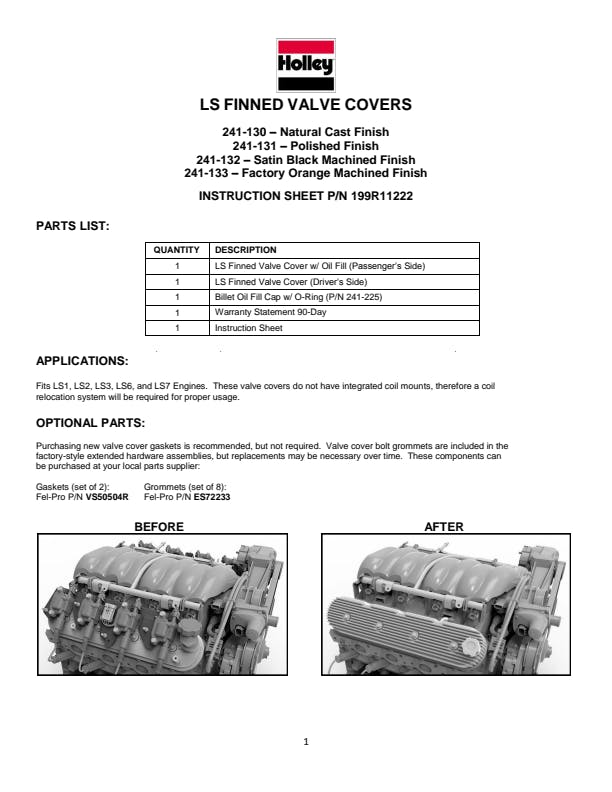 Holley's Vintage Series finned LS valve covers are the latest addition to our ever expanding line of products specifically designed for LS engines. Designed from our existing factory height LS valve covers, these Vintage Series finned valve covers eliminate the coil-on-cover look and instead feature a classic finned design that can add a cool retro style to your modern LS engine. The Holley Vintage Series LS valve covers were engineered to fit LS1, LS2, LS3, LS6 and LS7 engines and will clear up to a .750" lift cam with stock style rocker arms. Manufactured from die cast aluminum for a high quality finish, these valve covers includes an integrated OE style baffle and ventilation system, and a billet aluminum oil fill cap. Customers are encouraged to reuse the factory valve cover bolt assemblies or replace them with an LS valve cover bolt assembly (bolt and grommet) that better fits the style of their build. The OE valve cover gaskets are reusable, though they may need to be replaced over time - please check them carefully before installation to determine if a replacement is necessary. Dress up your LS today with Holley's Vintage Series finned LS valve covers!