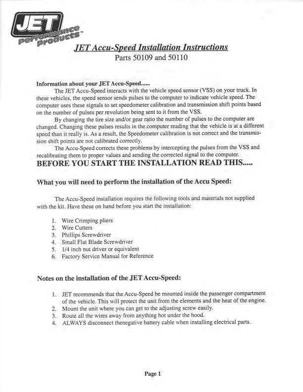 The Jet Accu-Speed for 93-up Dodge, Ford, GM, Jeep and Toyota trucks and SUV's modifies the vehicle speed sensor output readings to correct the speedometer after making gear ratio or tire size changes. Shift points in automatic transmissions are also corrected. The Accu-Speed connects to the transmission output speed sensor and is calibrated with the turn of a switch.