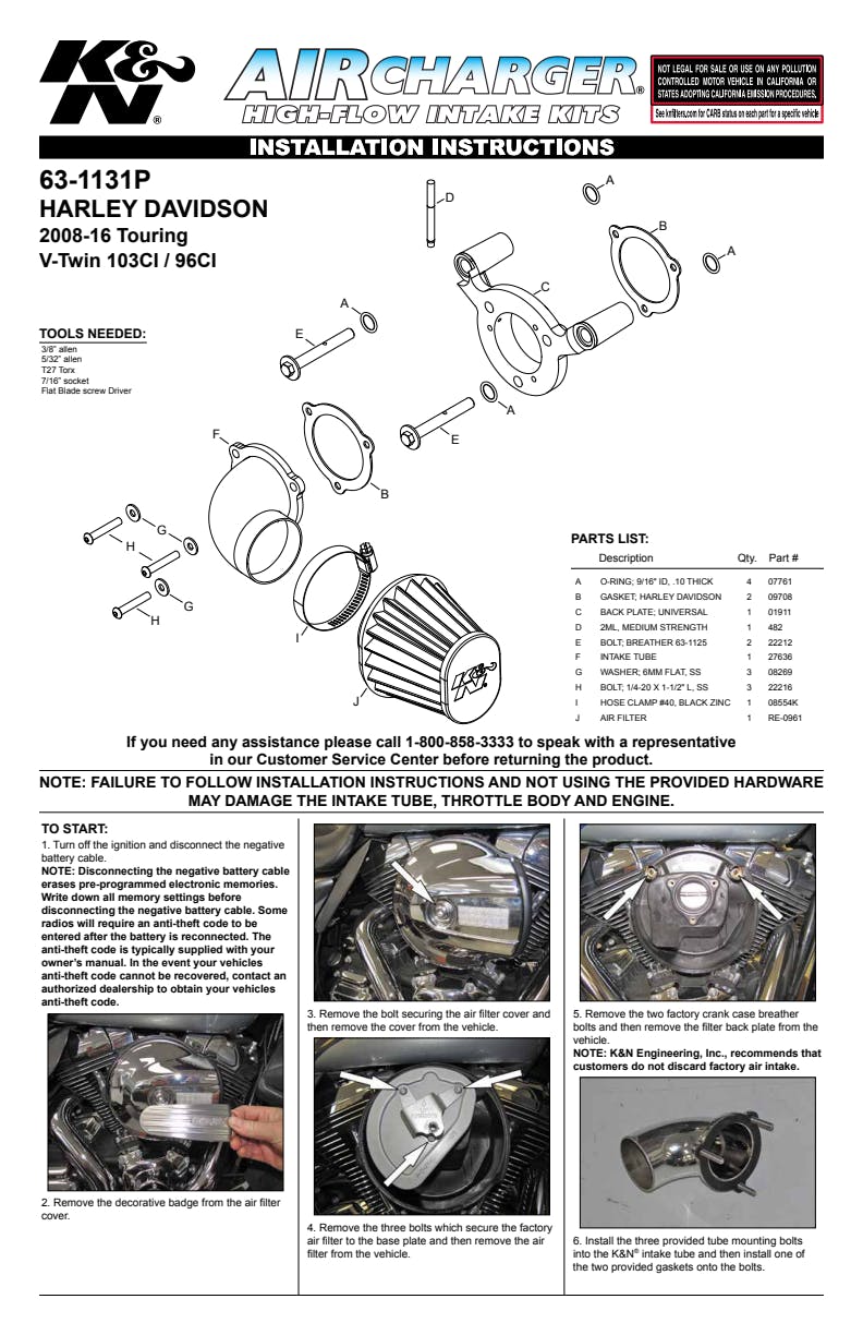 K&N AirCharger Air Intakes replace the restrictive stock OE air cleaner with a K&N High-Flow Air Filter and mandrel-bent aluminum intake tube. The efficient design provides your Harley with significantly more airflow, resulting in additional power. These air intakes come with a billet aluminum throttle-body mounting plate and mounting hardware. Each of these air intakes comes with a washable, reusable K&N high-flow air filter, backed by the No-Hassle Lifetime Limited Warranty. Installation is so easy, most intakes can be installed in 60 minutes or less. The sleek styling gives your Harley that coveted custom look while increasing performance.