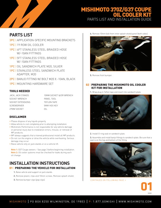| TechSpec Includes | Application-Specific Mounting Brackets--19-Row Oil Cooler--4ft Stainless Steel Braided Hose w/ -10AN Fittings--5ft Stainless Steel Braided Hose w/ -10AN Fittings--Oil Sandwich Plate M20, Silver--Stainless Steel Sandwich Plate Adapter, M20--Banjo Fitting w/ Bolt M20 x -10AN, Black--Mounting Hardware Set--Mishimoto Lifetime Warranty |