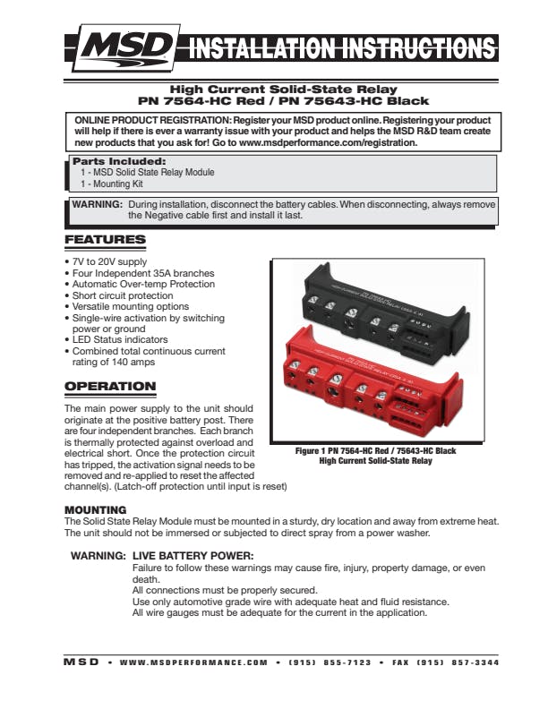 Clean up your wiring with an MSD Solid-State High Current Relay Block. This high current module takes the place of 4 standard relays and eliminates unsightly wiring. Four independent channels can be activated using either power or ground. Each channel is capable of handling up to 35 Amps of continuous current, providing up to 140 Amps of power. It also has the capability of Pulse Width Modulation (PWM). With a PWM input, you can control the output at a rate of 15 hertz and a duty cycle of 50-90%. Controls electric fans, water pumps, nitrous solenoids, auxiliary lighting and any other electrical accessories that would normally require a relay.