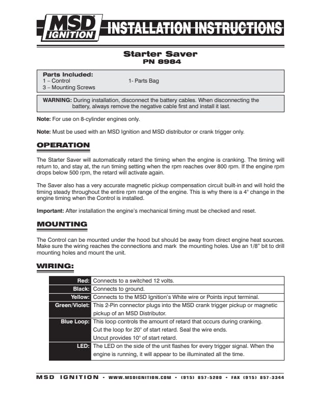 Note: The Starter Saver can only be used on V8 applications using an MSD magnetic pickup distributor or crank trigger.