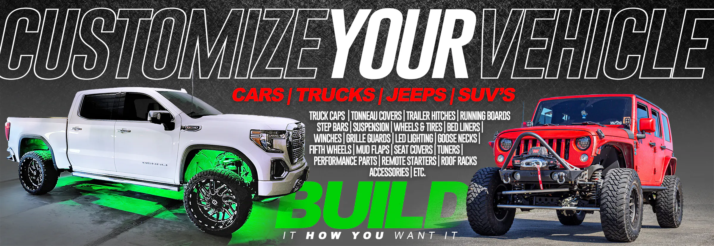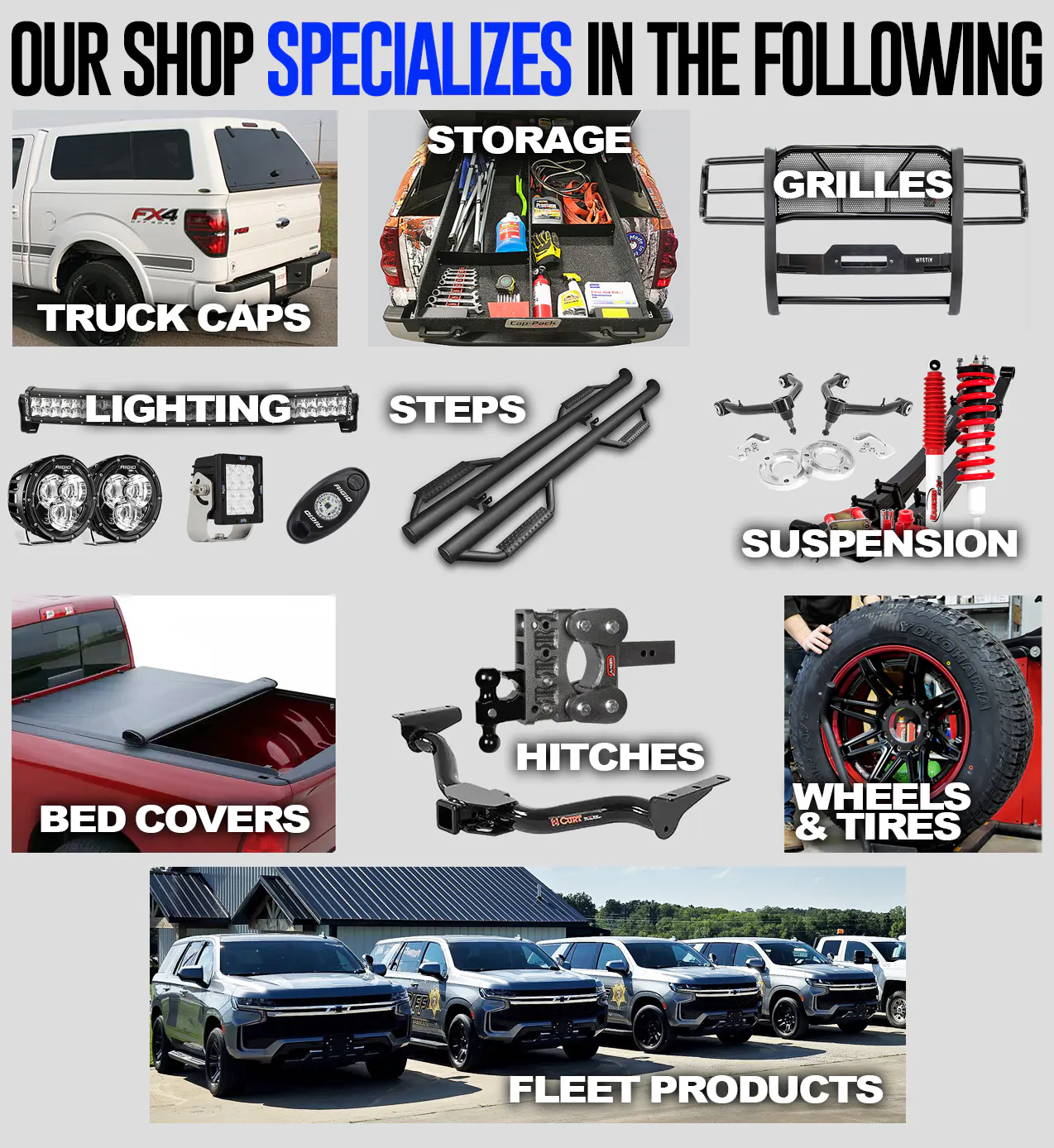 Our local shop specializes in Tonneau Covers, Truck Caps, Running Boards, Trailer Hitches, Suspension, Wheels, Tires, etc.