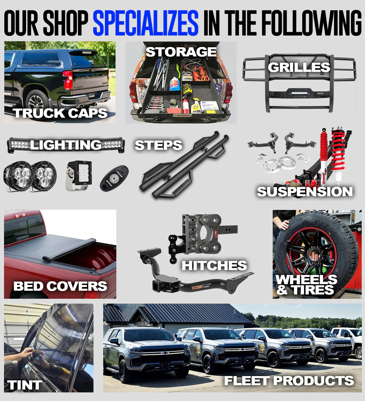 Our local shop specializes in Tonneau Covers, Truck Caps, Running Boards, Trailer Hitches, Suspension, Wheels, Tires, etc.